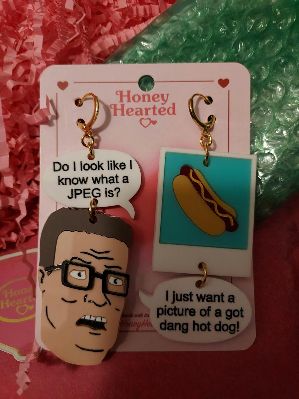 Created from acrylic, these earrings feature Hank requesting a picture of a hot dog.