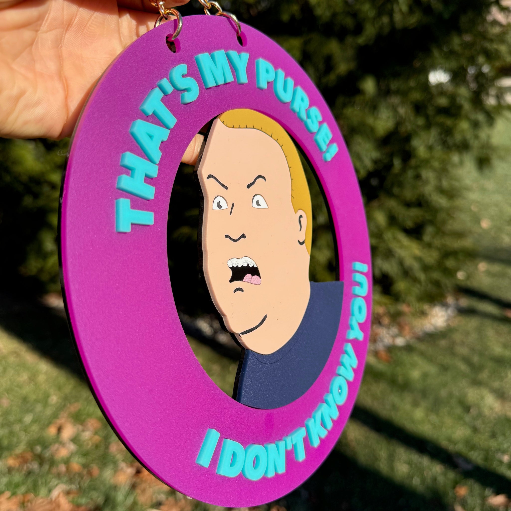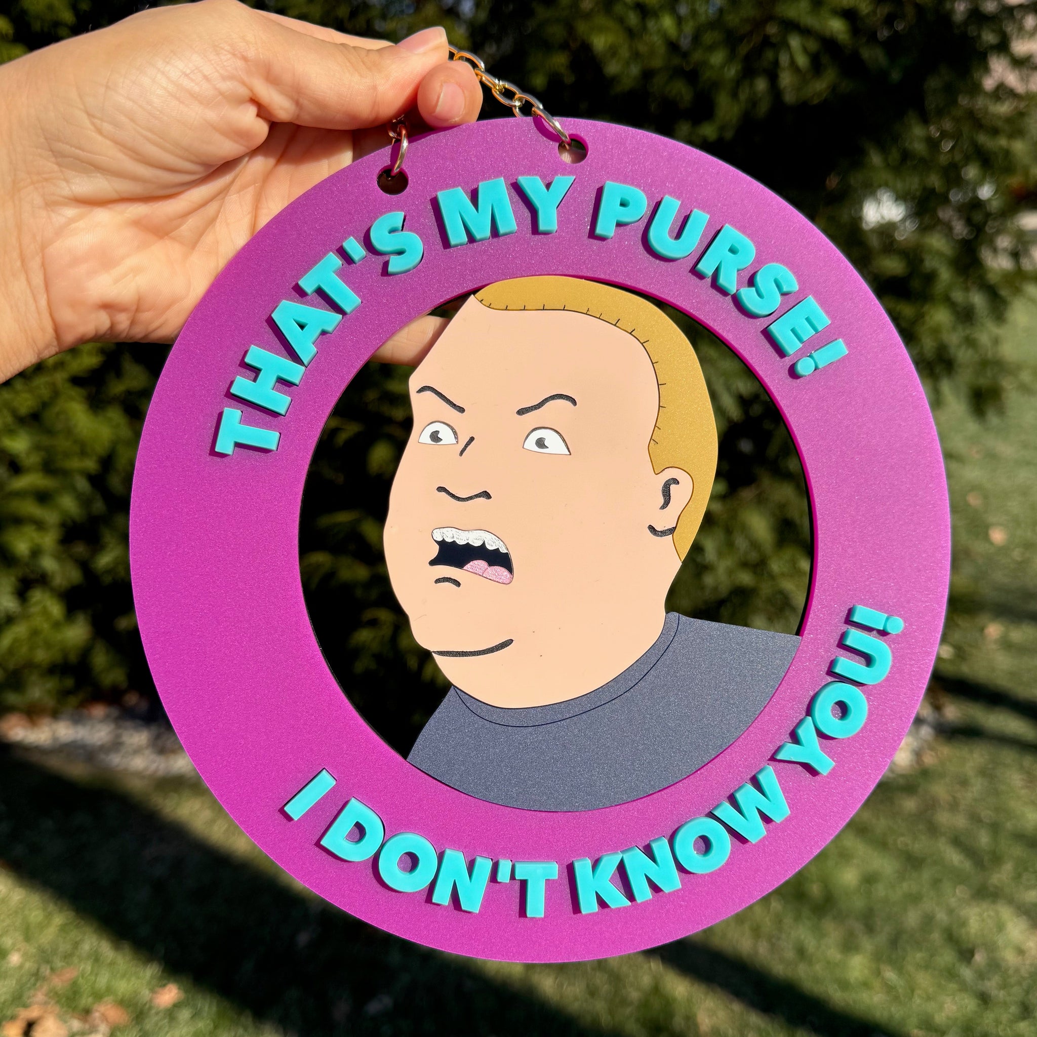 New and improved, this wall hanging is made of acrylic and measures 9.1 inches from top to bottom (previously 7.5 inches) and includes a sturdy gold chain to hang it on a hook from. Each letter is individually placed to create dimension and depth in the piece. The outside ring of purple is matte to avoid smudges or scratches.